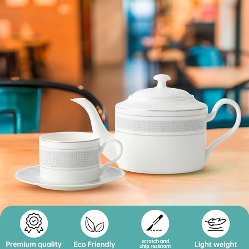 Elegant 1.3L White Fine China Teapot – Large Ceramic Teapot for 4 to 6 Cups with Silver Rim, Lightweight & Dishwasher Safe