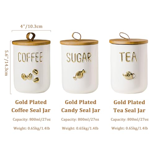 - Chic Design: The wide-mouth construction allows for easy access to contents. The wooden cover features a carrying belt design for effortless handling. The three-dimensional embossed gold-plated logo on the ceramic body aids in categorisation. The unglazed bottom promotes a smooth placement without compromising aesthetic appeal, adding a touch of sophistication to your kitchen countertop.