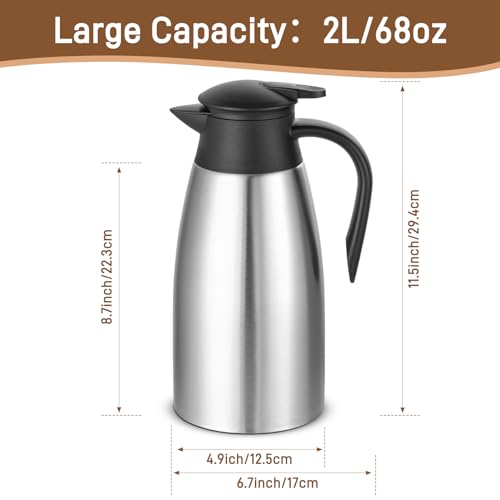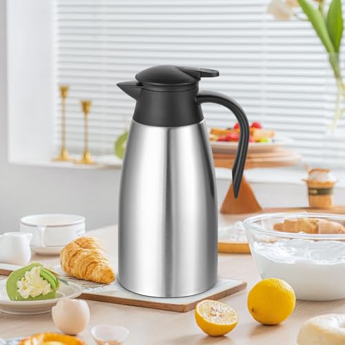 Osrioal 2L Thermal Coffee Carafe, Stainless Steel Insulated Jug with Press Button Lid, Double-Walled Vacuum Container for Hot and Cold Beverages, Silver