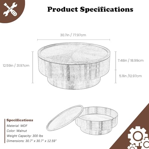 - ☕ Durable Round Wood Coffee Table: Crafted from high-quality MDF, this table boasts excellent stability and durability. The solid wood veneer not only enhances its longevity but also maintains a like-new appearance with regular cleaning. Load capacity: table top – 200lbs, interior – 100lbs.