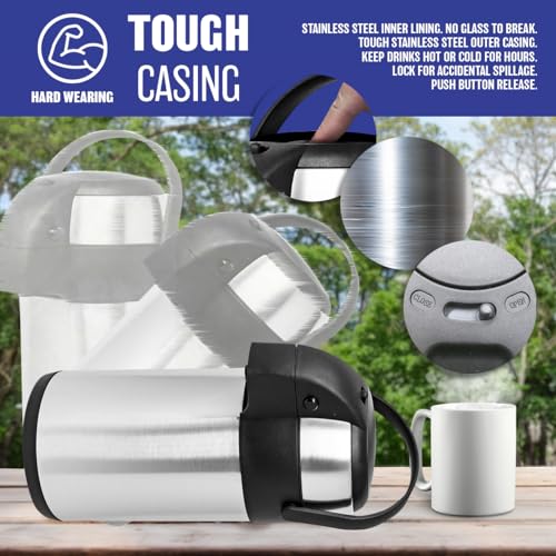 3 Litre Airpot – Tea & Coffee Carafe Pump Action Stainless Steel Air Pot | for Hot Beverages, Soup, 5 Litre Travel Jug with Carry Handle | Extra Durable for Catering, Fishing, Camping, Hiking, Garden