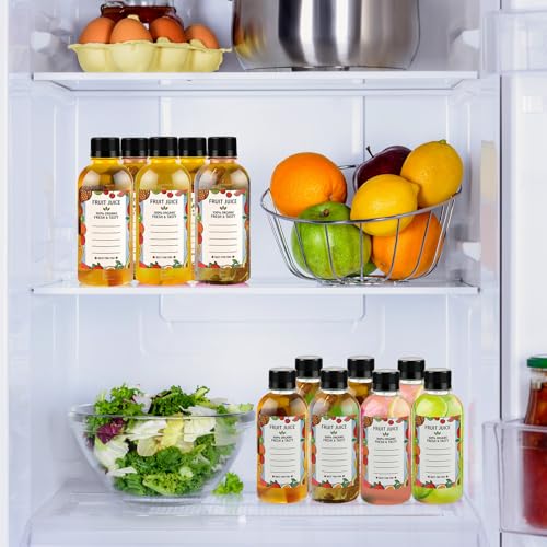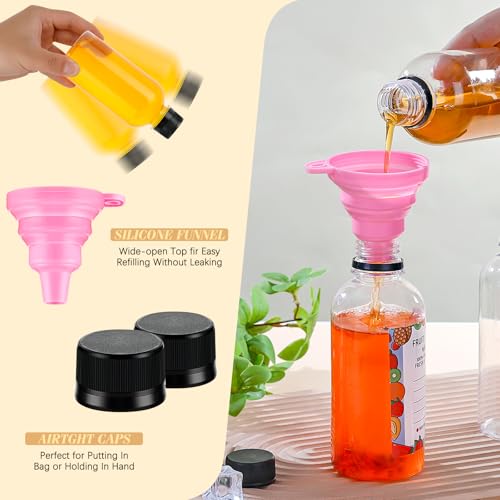 Clear juice shot bottles set This package includes 48 empty juice bottles, 48 tamper-proof black caps, 4 rubber funnels, and some labels. These plastic bottles are perfect for storing juices, milk, smoothies, and milkshakes, and are easy to clean and reusable.