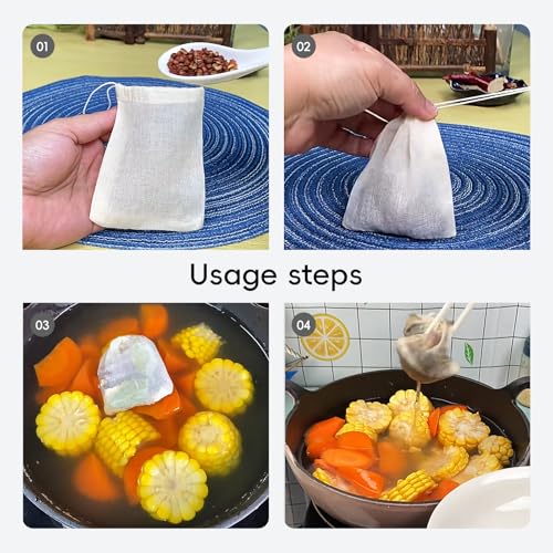 - Package Includes: 50 pcs spice bags, measuring 8 x 10 cm (3.15 x 3.94 inches). Their versatile design makes muslin bags for cooking a must-have in every kitchen and home. Rinse with water after use and hang to dry for next use.