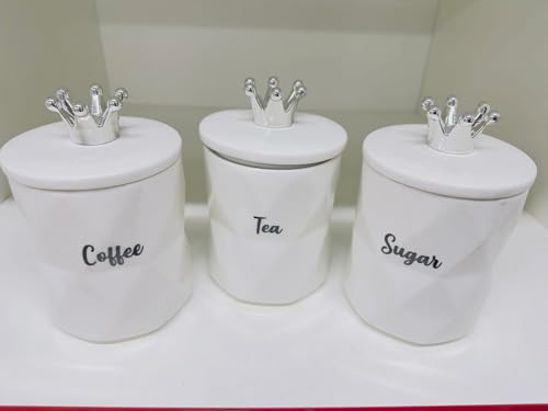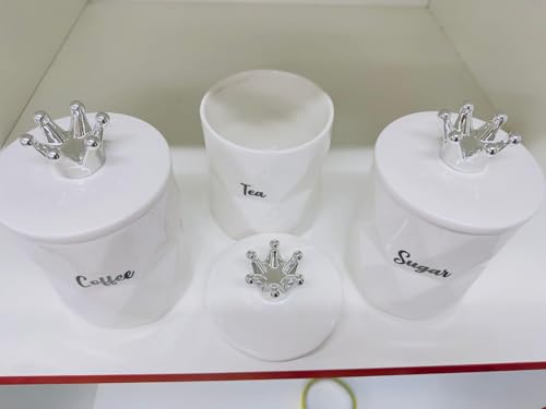 • ELEGANT DESIGN: Stunning white ceramic canisters showcasing a marble effect finish and ornate silver crown lids, ideal for both modern and classic kitchen aesthetics.