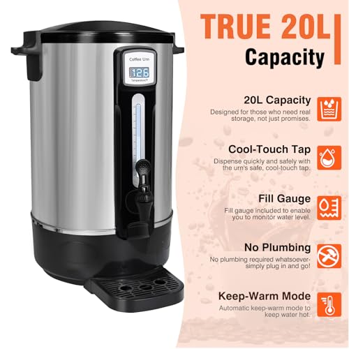 - A CERTIFIED CROWN PLEASANT: Serve 100 genuine cups (20L) of fresh coffee, 30% more than the hollow handle "20 litres" urns, making it perfect for hours of Sunday coffee or receptions for 50 guests. Constructed from double-walled 18/8 stainless steel, our commercial-grade urn maintains beverages at 160°F+ for 6 hours, enduring through 4 consecutive PTA meetings. The coffee machine features a two-way spout that pours 3 times cleaner than standard models (residual drops of 1 ml).