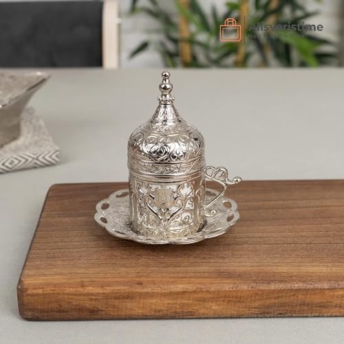 Alisveristime Premium Turkish Coffee Set – 12-Person Turkish Coffee, Cezve, 2-Person Cups, Delight Bowl, and Tray (4 Hues) (Silver)
