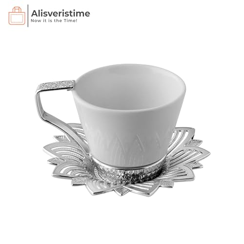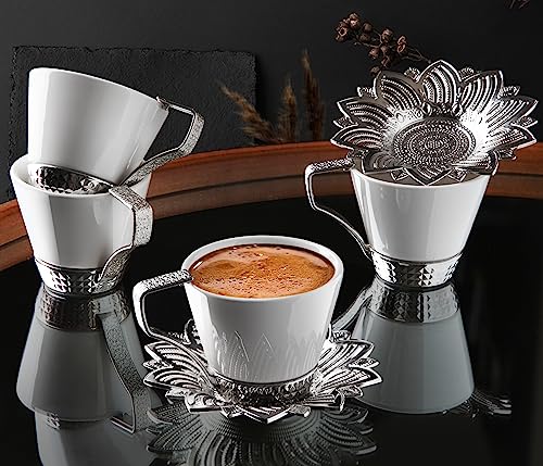 Alisveristime Set of 6 Turkish Coffee Cups with Porcelain, Zamac Holders & Saucers – Ottoman Gold and Silver Design (Selcuklu)