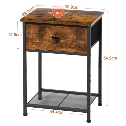 AMHANCIBLE Bedside Table Set of 2, Small Side Table with Fabric Drawer, Sofa Side Table with Storage Shelf, Nightstand with Metal Frame, Coffee Table for Bedroom, Living Space, Rustic Brown UHET03SDBR