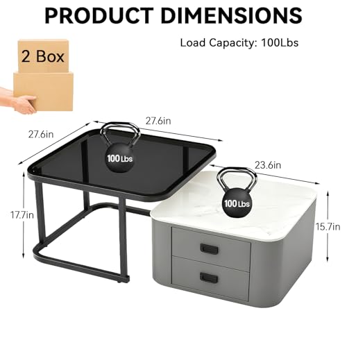 AMZSEW Coffee Tables, Nesting Tables Set of 2 Square Coffee Tables with Storage Drawers Marble Effect Centre Tea Table with Metal Frame, End Side Table for Compact Living Room/Bedroom, Grey
