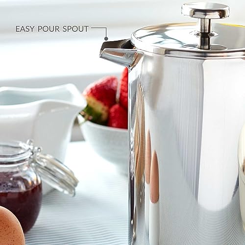 - DOUBLE-WALLED INSULATION WITH COOL-TOUCH HANDLE: Your coffee retains heat and stays warm throughout the day in this insulated cafetiere due to its high-grade double-walled design. The exterior remains cool to touch with zero condensation, ensuring easy pouring, carrying, and no water rings on the counter.