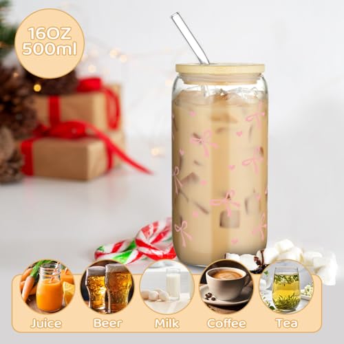 AOOTE Bow Iced Coffee Glass Cups – 500ml Can Shaped Glasses with Airtight Bamboo Lids & Straws, Ideal Gifts for Friends and Family