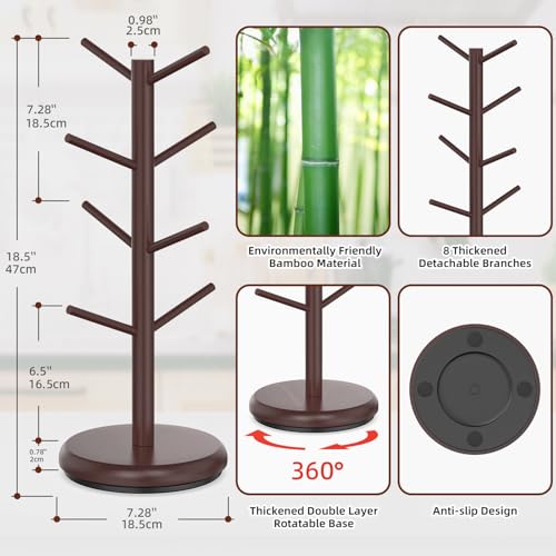 BAMBANG Bamboo Coffee Mug Tree, Rotating Coffee Cup Holder for Countertop, 8 Hooks, Mug Organiser, Display, Espresso