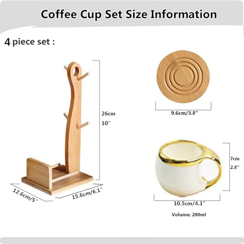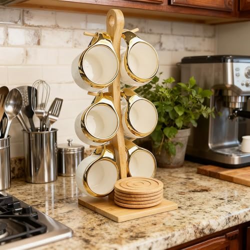 Stylish Bamboo Mug Tree with 4 Elegant White and Gold Trim Ceramic Teacups and Wood Heat-Resistant Coaster – Compact Coffee Cup Stand with 4 Hooks 12.6×15.6x26cm for Office
