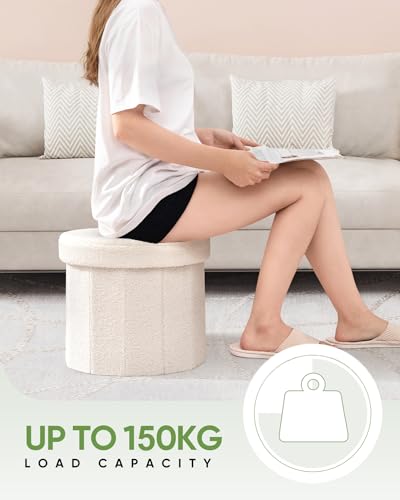 Bonlife White Boucle Ottoman with Storage, Foldable Footstool for Living Room, Toy Chest, Storage Seat Teddy Round Shape Footrest, 38X38X33.5cm