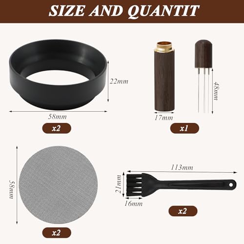Set Contents: This set includes 2 black 58mm dosing funnels, 2 filters, 2 coffee brushes, and 1 powder cloth needle. The measuring ring funnel is precisely crafted to fit 58mm filters, making it an indispensable tool for artisanal coffee, allowing you to effortlessly filter coffee particles and indulge in the joy of manual coffee preparation.