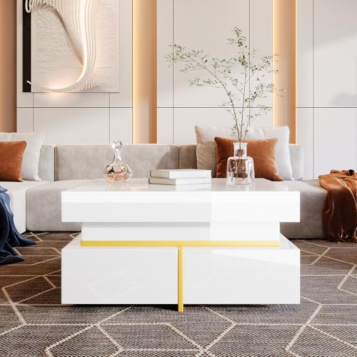 BTM Square Coffee Table with Drawers and Gold Accents, High-Glossy Coffee Table with Storage, White, 70x70x35.5cm