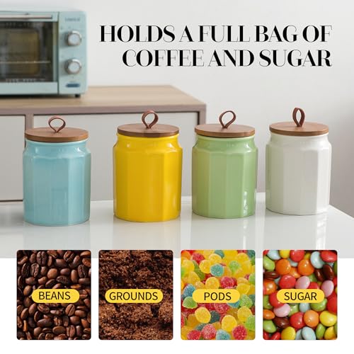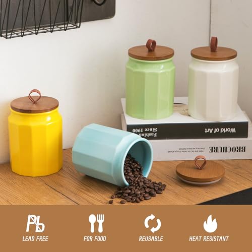 - Versatile Ceramic Canister Set with Unique Colours: The ceramic canister set showcases a distinctive vertical texture and is available in four vibrant hues—yellow, green, blue, and white—ensuring effortless organisation of your kitchen essentials. Ideal for storing coffee beans, sugar, flour, tea, cookies, spices, grains, pasta, or even dog treats, these canisters are as functional as they are stylish. The assorted colours not only enliven your kitchen but also facilitate quick identification of the contents in each jar.