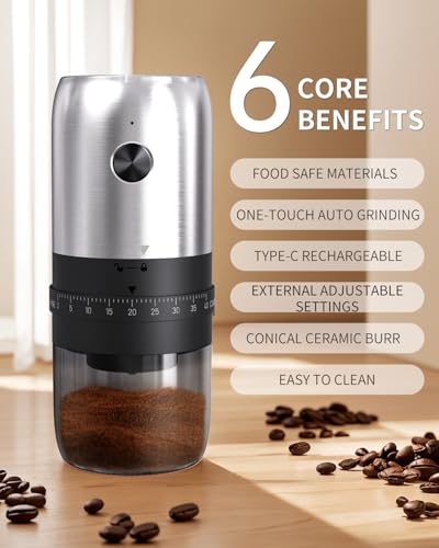 CIRCLE JOY Stainless Steel Electric Coffee Bean Grinder, One Press Operation Cordless Conical Burr Coffee Bean Mill with 40 Adjustable Settings, USB Rechargeable and Washable Container