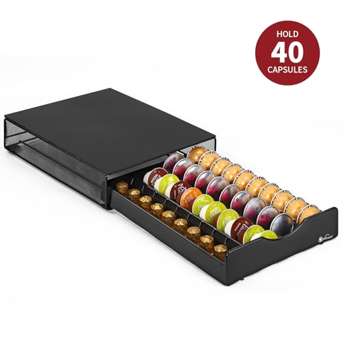 - Capsules Organiser: This sliding coffee pod storage drawer is designed to hold up to 40 coffee capsules in fixed slots, maintaining neatness and easy accessibility. Compatible with Vertuoline, Dolce Gusto, K-Cup, and Nespresso pods.