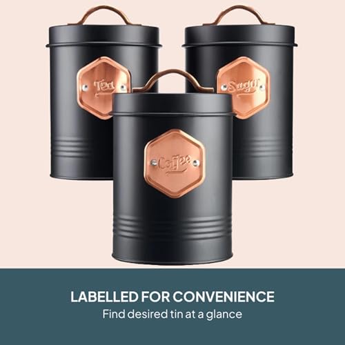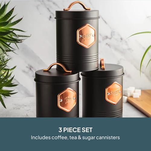 Cooks Professional 3 Piece Tea Coffee Sugar Canister Set | Labeled Storage Tins | Containers with Airtight Lids | Canisters for Kitchen Necessities & Essentials | Black & Copper