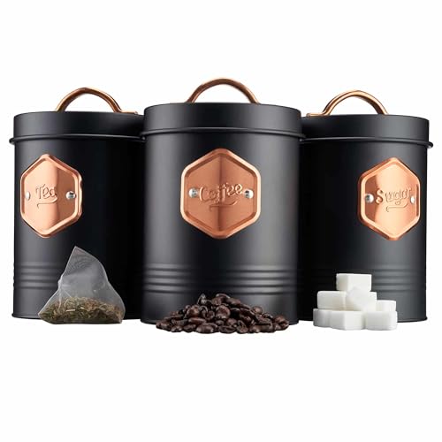 Cooks Professional 7 Piece Tea Coffee Sugar Bread Biscuit Pasta & Utensil Canister Set | Labeled Storage Containers Tins with Airtight Lids for Kitchen Accessories & Essentials | Black & Copper
