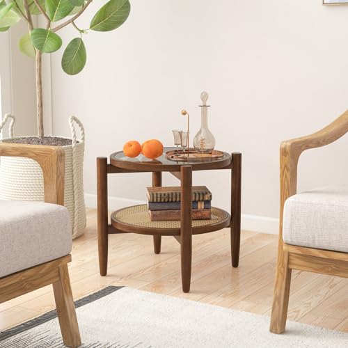 COSTWAY Round Side Table, 2-Tier PE Rattan Sofa End Table Accent Nightstand with Tempered Glass Top and Acacia Wood Legs, Compact Coffee Snack Tea Tables for Living Room Bedroom Office (1PC, Brown)