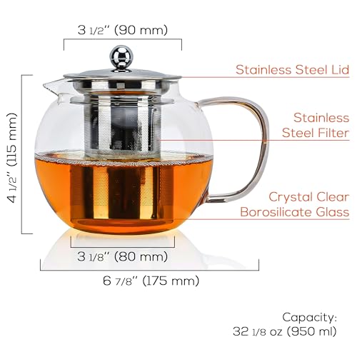 • Stylish and Compact Design: This 950ml borosilicate glass teapot with infuser is ideal for steeping your preferred herbal, loose-leaf, or chai teas. Its compact size and elegant clear glass design integrate effortlessly into any kitchen or tea-serving arrangement.