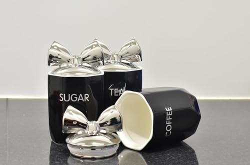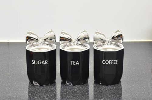 DEENZ Set of 3 Jars with Silver Bow Lids Kitchen Canister Jars for Tea, Coffee & Sugar Storage Pots Marble Effect Home Decor Dining Table Eye-Catching Glamorous Design (BLACK)