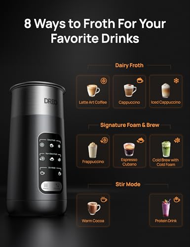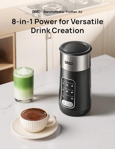 DREO Electric Milk Frother, 8-in-1 Silent Steamer & Hot Chocolate Maker, 270ml Stainless Steel Automatic Foam Frother for Latte Art-Level Microfoam and Coffee, Easy to Clean, LED Display