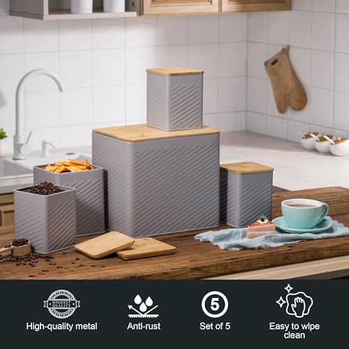 EHC 5 Piece Kitchen Storage Canister Set – Tea, Coffee, Sugar, Biscuit, & Bread Bin With Lid, Airtight Containers with Lid, Jars Set of 5, Kitchen Essentials & Accessories, Grey