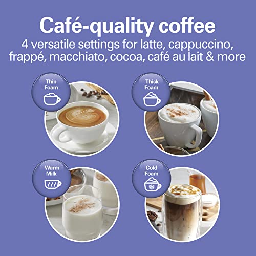 - CREATE EXQUISITE LATTES, CAPPUCCINOS, FRAPPES, MACCHIATOS, COCOA, AND MORE: Craft café-quality beverages with four options: warming and producing thin foam, warming and creating thick foam, making cold foam, or just warming.