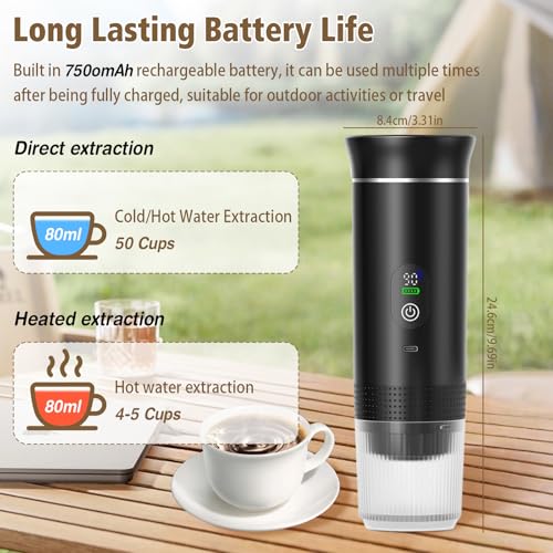 - Long-lasting Battery Life: Powered by three 18650/2500mAh batteries, this coffee machine boasts an impressive battery longevity. It can provide up to 4 extractions when fully charged with heated cold water, or up to 50 extractions with direct cold or hot water usage, allowing you to savour multiple cups of coffee without concerns about battery endurance.