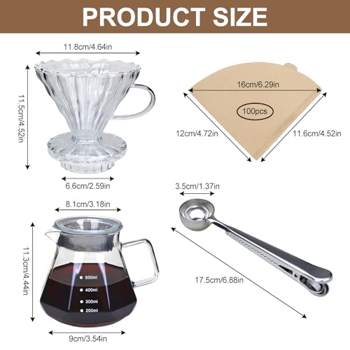 FACIACC Pour Over Coffee Maker, 600ml Borosilicate Glass Coffee Pot with Glass Lid, 50pcs Paper Filters, Pour Over Coffee Dripper and Coffee Scoop for Home, Restaurant, Café, Camping, Transparent