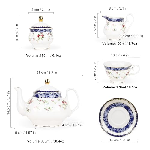 - Size and Capacity: Teapot capacity: 860ml, dimensions: 19.5 x 12 x 8.5cm; Cup capacity: 150ml, dimensions: 8.5 x 6cm; Sugar bowl capacity: 200ml, dimensions: 8 x 6.5cm; Milk jug capacity: 180ml, dimensions: 7.5 x 8.5cm; Saucer diameter: 13cm. Please verify the size and volume before placing an order.