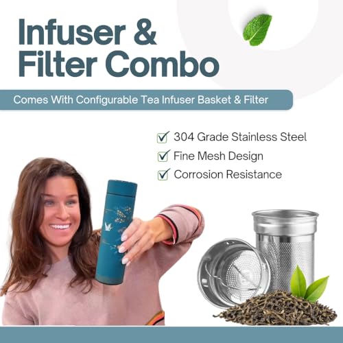 - LOOSE LEAF TEA INFUSER & FILTER: This loose leaf tea bottle features a fine mesh 304 grade infuser/filter combination. Use it to brew coffee, tea or create fruit-infused beverages wherever you are. Easily remove the filter/infuser to transform it into a mug or water bottle.