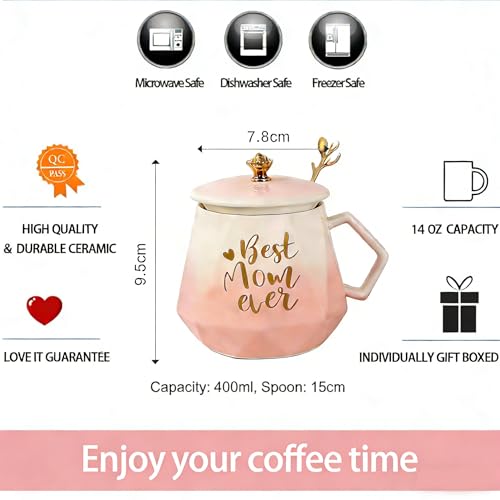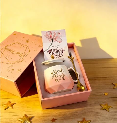 Favritt Best Mum Mug Gift Set with Lid and Spoon – Pink Ceramic Coffee Cup with Greeting Card for Mother’s Day and Birthday Gifts for Women