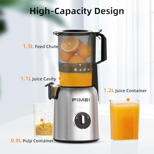 - 135mm Wide Feed Chute & 1.5L Large Capacity Juicer: This juicer is designed with a 135mm wide feed chute and a 1.5L large capacity, enabling you to effortlessly process whole fruits and vegetables without prior cutting. Save time, free your hands, and produce more juice. The FIMEI juicer is perfect for batch juicing, family breakfasts, or healthy single servings. It comes equipped with a safety lock to avert accidental injuries to you and your children!