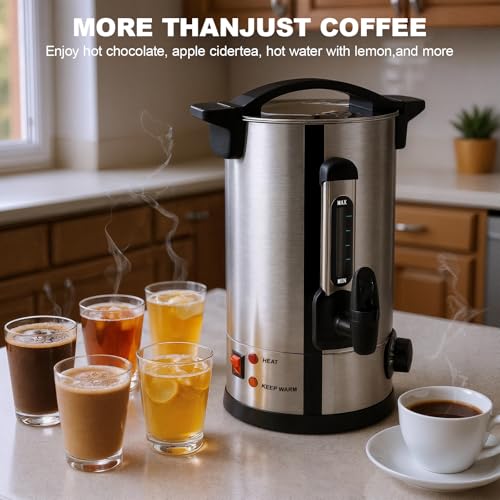 - 【Durable & Safe to Use】Constructed from high-quality 304 stainless steel, this commercial coffee maker ensures long-lasting reliability. The twist-lock lid, cool-touch handles, and anti-drip tap provide smooth and secure operation—making this 100 cup coffee maker safe to handle and easy to pour.