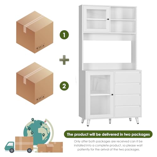 - This tall cabinet, featuring glass doors and open shelves, beautifully displays your items, making it perfect for coffee, wine, spices, and food. The 4 drawers provide ample storage for plates, knives, forks, and other cutlery, while the wide countertop allows for placing your microwave, toaster, coffee maker, and juicer, as well as food preparation.