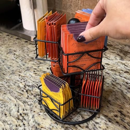 - Multifunctional Organizer: This metal rotating tea bag organiser can also accommodate sugar, coffee creamer, sweeteners, drink sticks, and other small bagged items.