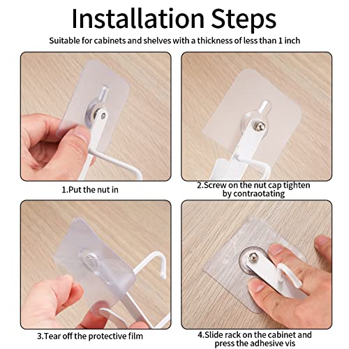 - Easy to Install: Simply slide the under shelf hooks over the cabinet or shelf; the adhesive along with the screw helps secure the end of the hook on the cabinet, preventing it from stretching down due to the weight of the cups.