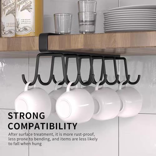 Ghshanog 2Pcs Mug Holder Under Cabinet, Black Coffee Cup Holder Rack, Double-Row No Drilling Under Shelf Mug Hanger with 12 Hooks, Mugs Storage Hanging Rack for Cups, Glasses, and Kitchen Utensils