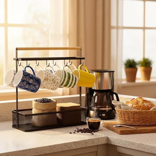 Hiceeden Coffee Cup Holder with Storage Basket, Coffee Mug Tree Rack with Handle, Cup Stand Coffee Station Bar Organiser for Countertop, Holds 8 Cups (Black)