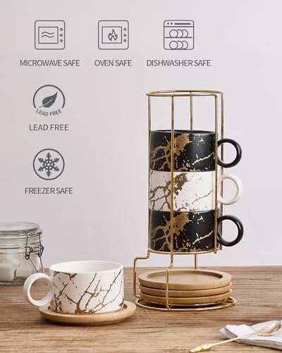 HOME DECOR Stackable Ceramic Coffee Mugs – 160ml Espresso Cups Set of 4 with Wooden Saucers and Metal Stand for Double Espresso, Cappuccino and Latte Macchiato – Marble Collection