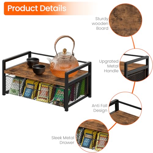 Homode Wooden Tea Bag Organizer – Rustic Brown Tea Organiser and Storage Chest with Drawer for Countertop Kitchen Display