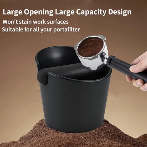 - 【PREMIUM COFFEE KNOCK BOX】This 4.8-inch knock box is constructed from high-quality ABS material, ensuring durability. The knock bar is made from resilient and flexible silicone with a robust steel core, minimising noise and protecting your portafilter when struck. Exquisitely carved notches on the sides keep the knock bar securely positioned.