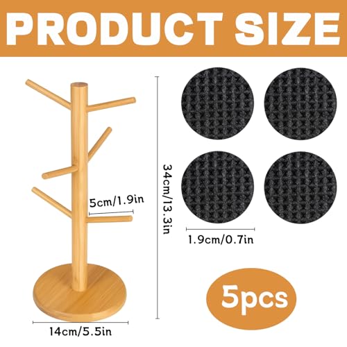 IAndhy Mug Tree for 6 Mugs, Wooden Stand with 4 Non-Slip Pads, Space-Saving Cup Holder for Kitchen and Office, Bamboo Cup Tree for Coffee and Tea Mugs (14x34cm)