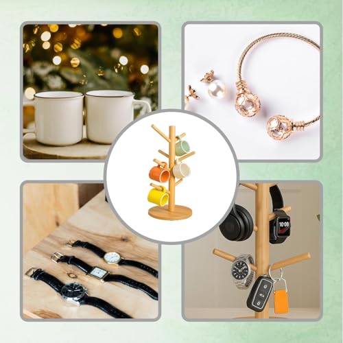 • Spacious Mug Tree This wooden mug tree accommodates up to 6 cups, whether a coffee mug or a water cup, ensuring tidy storage that is easy to access. Keep your kitchen or office countertop organised and free from clutter. The robust design guarantees stability even when fully loaded.