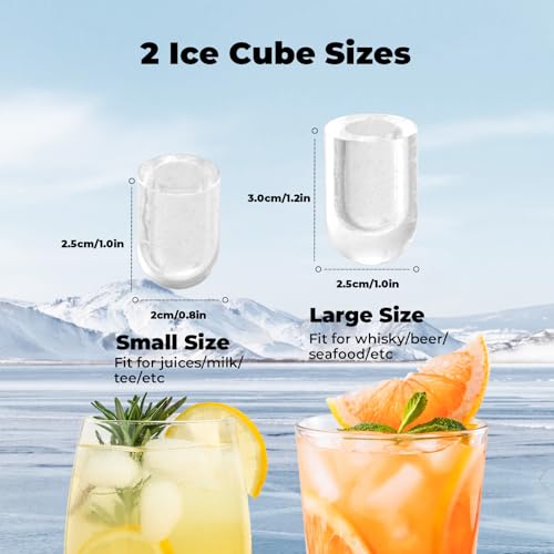 - Two Ice Sizes Available: Enjoy perfectly chilled beverages with two ice size options. The small cube is ideal for juices and milk, while the large cube is perfect for beer and seafood. The countertop ice maker includes a standing ice scoop.
