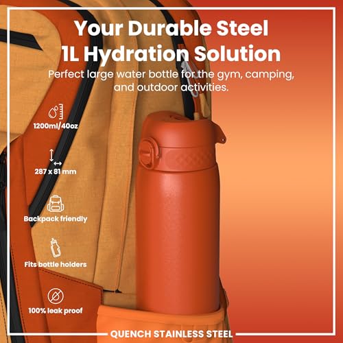 ION8 Lightweight 1 Litre Stainless Steel Water Bottle – Non-Insulated, Leak Proof, Easy Open with Secure Lock – Ideal for Travel & Active Lifestyles in Hearty Orange